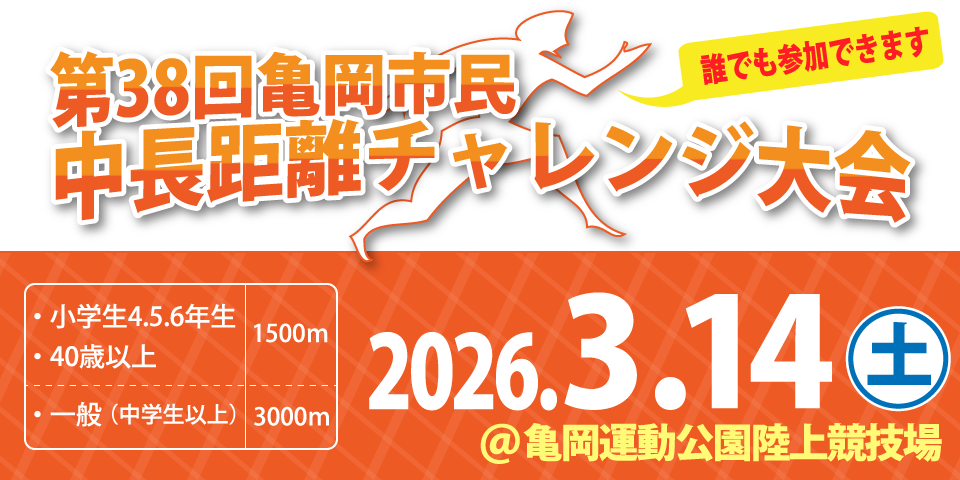 知らせ2026年3月14日(土)に開催致します第38回亀岡市民中長距離チャレンジ大会の"実施要項"、"申込ファイル"をアップしました。